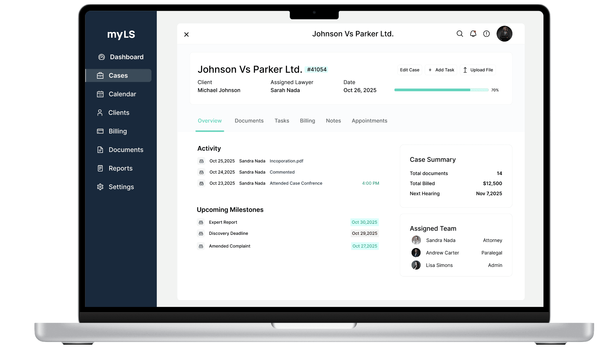 Cases open to a single, structured timeline. Every document, update, and deadline lives in one place, in the order legal work actually happens. The lawyer no longer searches for information. The system brings the next action forward.
